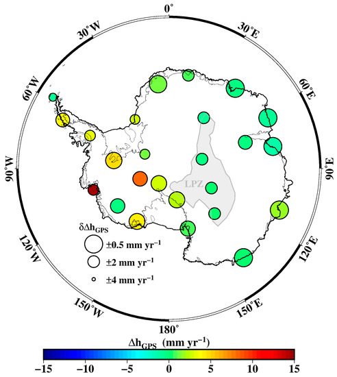 Figure 2. The Global Positioning System (GPS) observations for crustal uplift rates and corresponding uncertainties in Antarctica over the time span of 2003–2013. The radius of the circle denotes the uncertainty (as the radius is larger, the uncertainty becomes smaller). Gray area denotes low-precipitation zone (LPZ). The GPS data are from Sasgen et al. [79].