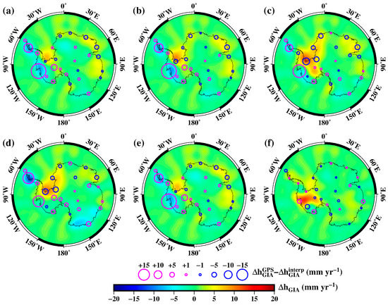 Figure 3. Estimated GIA uplift rates from the JIE method using the suggested ETM models from the following authors: (a) Wahr et al. [16]; (b) Riva et al. [18]; (c) Gunter et al. [20]; (d) Ligtenberg (personal communication, 2017); (e) This study (further approximation); (f) This study (optimal approximation), and their comparisons with elastic-corrected GPS uplift rates.