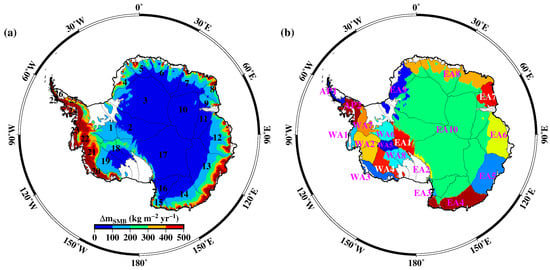 Figure 4. (a) The mean SMB ( Δ m S M B ) over the time span of 2003–2009 and the Antarctic drainage systems; (b) The divided 20 subregions in Antarctica.