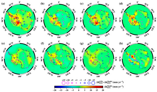 Figure 5. Antarctic GIA uplift rates estimated from the following solutions: (a) RF3L20; (b) W12a; (c) A13; (d) ICE6G; (e) G14; (f) G16; (g) RATES; (h) REGINA, and their discrepancies of GIA uplift rates with GPS observations computed at each station.