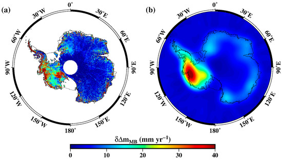 The uncertainties of our JIE result are computed by formal error propagation from the individual input sources. For the right side of Equation (12), the uncertainties of Δ h G I A and Δ h e l a can be negligible due to the effect is far smaller than δ Δ h I C E S a t , the uncertainties of Δ C is difficult to assess due to insufficient error information for SMB model and μ values, so an standard deviation of 20% of the value for each grid point is assumed as a conservative error estimates of Δ C . Then δ Δ h I C E S a t (Figure 1d), δ Δ C and δ Δ m G R A C E (Figure 1b) can be formally propagated using Equations (7) and (12) to generate total uncertainties for ice sheet and GIA-related mass change as shown in Figure 6. Among the three error sources, δ Δ h I C E S a t has made the largest contribution to both δ Δ m M B and δ Δ m G I A , so the uncertainties for both ice sheet and GIA-related mass change are largest in the Amundsen Sea Embayment of WA (shown in Figure 6) where the errors of ICESat are most notable (Figure 1d). The overall errors in per drainage basin are computed from the error covariance of all grid points within a given region (see Table 5). And, for more accuracy, we consider that the errors in the gridded data are spatially correlated, a Gaussian window of decorrelation-length scale of 300 km is used to approximate the covariance that is a function of the distance between grid points [91].