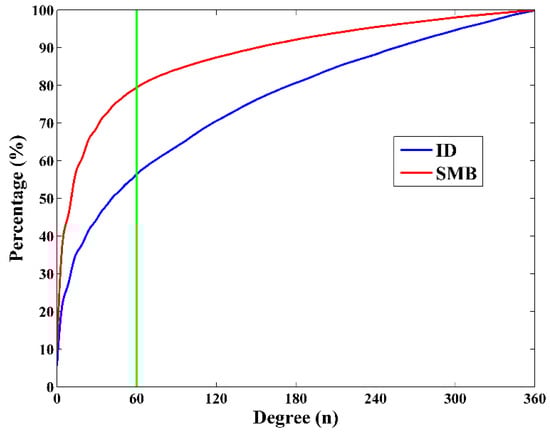 Figure 7. The percentage of accumulated degree amplitudes in total for the ice discharge (ID; blue) and the SMB (red). The ID grid point values are simulated from the Antarctic ice velocity [32], and the SMB grid point values are shown in Figure 4a, all grid values are expanded into spherical harmonic coefficients of degree and order 360. The accumulated degree amplitudes [94] of n are estimated over a spectral band from 0 to n, and the total amplitudes are estimated over the spectral band from 0 to 360. The green line is the location of n = 60.