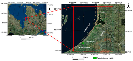 The Kwakwatanikapistikw (KWAK) Valley (latitude 55°19’50" N; longitude 77°30’05" W) is a long-term monitoring site of the Centre of Northern Studies (CEN) of Laval University (Figure 2) and is in the sporadic permafrost zone. It is one of the most well-studied lake areas in subarctic Canada and hence was selected for the present study. The area for ground truthing by UAS survey was 0.5 km2 and included numerous thermokarst lakes and ponds that range in size from meters to tens of meters in length. The waterbodies close to rock outcrops show a darker color, are older and have a higher organic matter content (higher DOC and lower TSS), while the lakes further away from rock outcrops are more recent, more turbid and show more TSS and lower DOC [6,12].