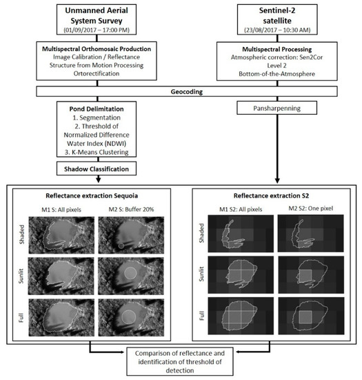 Delineation of the waterbody boundaries was essential to obtain accurate spectral values from the two remote sensing sources. We used a hybrid image classification approach [36] that was divided in three stages: i. multiresolution segmentation for the definition of the borders between water and non-water surfaces, ii. threshold definition using multispectral indices for the classification of the water bodies, and iii. non-supervised classification using K-Means Clustering for classifying the shady and sunlit areas inside the water bodies. The delineation procedure was applied using the very high-resolution mosaic obtained from the Sequoia camera.