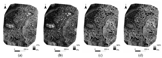 UAS survey derived reflectance for KWAK (31/08/2017, 17:00): (a) Green (530–570 nm); (b) Red (640–680 nm); (c) Red Edge (740–740 nm); (d) Near Infrared (770–810 nm).