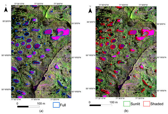 Results of the thermokarst lake and pond classification in a part of the KWAK study area: (a) Results of the delineation using the multiresolution algorithm and NDWI threshold classification; (b) Identification of the shaded and sunlit areas following the K-Means Clustering. Background orthomosaic is a Green (red channel), Red (green channel) and Red Edge (blue channel) color composite obtained from the UAS survey.