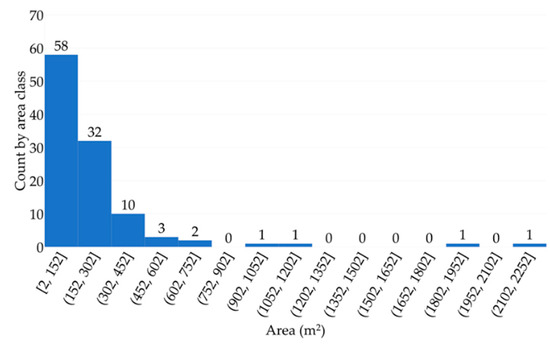 The identification and delineation procedure showed the presence of 109 lakes and ponds in the KWAK area, covering 23,188 m2 in a total surveyed area of 468,991 m2, which corresponded to 5% of the total study area. The lakes had an average area of 212 m2 and a large standard deviation of 309 m2. The size distribution was positively skewed, with 50% of the water bodies below 150 m2 and 80% below 300 m2 (Figure 9).