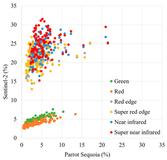 Despite the same general waveband overlaps, the Sequoia and S2 sensors show differences in central wavelength, width and radiometric depth. This is a limitation of the current approach and needs to be further assessed. We assume that the differences would have generated noise that may decrease the quality of the correlation but that would not affect the overall comparison. While S2 has a depth of 12 bits, the Sequoia has 10 bits. In this approach, we compared the Sequoia and S2 bands using the ones with closest central wavelength match, as shown in Table 1.