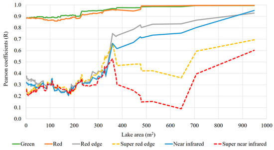 In order to evaluate the effects of lake area on the values of the Pearson correlation coefficients between the ground truth survey (UAS with Parrot Sequoia) and the S2 scene, we ranked the water bodies per area and conducted consecutive correlations using all lakes above a certain lake area threshold. As expected, a general increase in R was found as the threshold of lake area increased, as shown in Figure 11. This occurred in all bands, except in those which were pansharpened. In the visible spectrum, there was always a strongly positive correlation with the ground truthing, with a value close to 1 for waterbodies of about 500 m2. Such a behavior did not occur at the Red Edge and NIR bands, which showed a slight reduction in R with increasing lake area up to 200 m2, reflecting spectral mixture between water and the surrounding vegetation. The increase after that threshold should be linked to the increase of the water body to surrounding terrain ratio in the satellite pixel, as lake size increased. R increased regularly after 200 m2, became strongly positive above 350 m2 (R > 0.7, p < 0.01), and further increased thereafter.