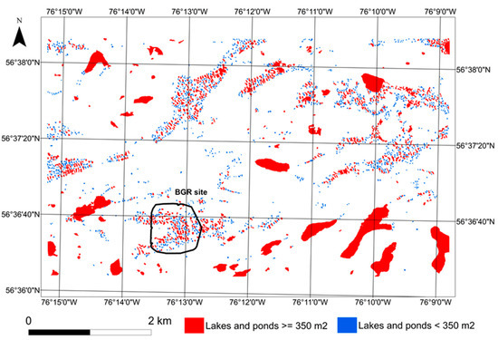 Although the high versatility, adaptability and flexibility of the UAS systems, these cannot compete with satellite imagery in terms of spatial coverage [24]. Therefore, using a WorldView-4 scene of 25 km2 around the KWAK site (Figure 12), we delineated 999 lakes and ponds, with 109 of them showing more than 350 m2. This means that S2 may allow for monitoring around 11% of the lakes and 73% of the total lake area. Based on a WorldView-2 scene for a subarctic region further northward (site BGR, located in the Sheldrake River Valley in the vicinity of Umiujaq), the representativeness of the minimum water body size class increased to 30% of all lakes and 85% of the total lake area (Figure 13).