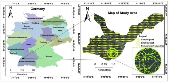 The establishment of a systematic sample plot grid is one of the basic elements of forest management in the state forests in Baden–Württemberg. The sample plots used in this study were established in the course of such forest management inventory. A total of 449 permanent circular concentric plots in March 2015 were measured by the state forest service of Baden–Württemberg, as shown in Figure 1. Out of the total sample plots, 367 were dominated by coniferous trees, 74 were dominated by deciduous trees, and eight were located in open regeneration areas without solid wood. The inventory sample plots were arranged by a systematic regular grid of 100 m by 200 m (Figure 1). Each sample plot consisted of four concentric circular subplots of 2, 3, 6, and 12 m radii. The trees measured at each circular plot depended on tree threshold diameters at breast heights of 7, 10, 15, and 30 cm, respectively. Tree heights were only measured on a subset of the sample trees, concerning species and stand layer. The heights of the trees without measurement were calculated using height–diameter tariffs, which were adjusted for each plot according to the measured heights. Lorey’s mean height was calculated according to the following equation developed by Lorey [22].