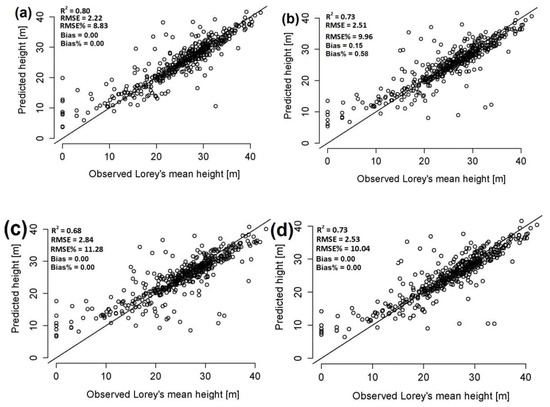Observed versus predicted Lorey’s mean height. (a) ALS; (b) Image-based point clouds (80/60%); (c) Image-based point clouds (60/30%), and (d) Image-based point clouds (80/60%) panchromatic band.