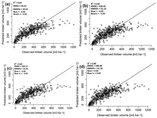 Observed versus predicted timber volume. (a) ALS; (b) Image-based point clouds (60/80%); (c) Image-based point clouds (60/80%) panchromatic band; and (d) Image-based point clouds (60/30%).