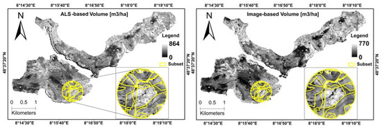 Comparison of the final predicted maps of timber volume (m3\ha) produced from the ALS and image-based point clouds (80/60%).