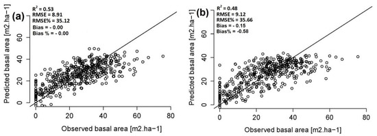 The scatter plots derived from our models showed an overestimation of volume and basal area at the lower ranges, and under estimation at the higher ranges (Figure 4; Figure 6). This could be due to the presence of older trees where the growth of height become slower as they get older and prevents them from growing beyond a certain height due to hydraulic limits to tree height as compared to young trees [34]. It is also worth noting that we used tree height as one of the explanatory variables for forest timber volume and basal area estimation. Overlapping tree crowns located outside of the border of the sample plots could also be one of the reasons for the overestimation, which appears to be one of the limitations of integrating forest inventory field survey data and remote sensing datasets using an area-based approach [29]. However, this would also work in reverse as some crowns on the edge of the plot are partially included, and hence statistically neutralize each other.