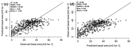 Observed versus predicted basal area. (a) ALS; (b) Image-based point clouds (60/80%); (c) Image-based point clouds (60/30%); and (d) Image-based point clouds (60/80%) panchromatic band.