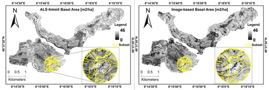 Comparison of the final predicted maps of the basal area (m2\ha) produced from the ALS and image-based point clouds (80/60%).