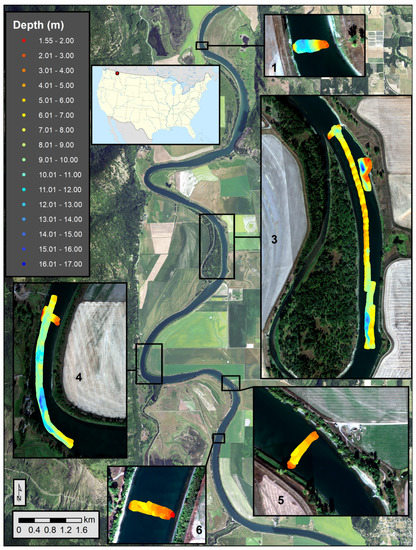 Study area along the Kootenai River in northern Idaho, USA. The index map shows the location of the study area in the context of the United States as a red dot. The scale bar pertains to the overview map in the background. Zoom insets are provided for each of five study sites, with sites 1, 5, and 6 drawn at the same scale of 1:6000, whereas sites 3 and 4 are more extensive and are depicted at a scale of 1:12,000. Depth measurements derived from a multibeam echosounder survey are shown for each site and the same legend applies to all of the insets. The channel is typically on the order of 150 m wide, with flow from south to north.
