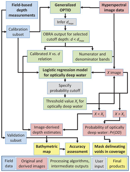 Figure 2 provides a conceptual summary of the overall workflow involved in not only estimating water depth for those locations where spectrally based depth retrieval is feasible but also delineating areas of optically deep water beyond the sensor’s maximum detectable depth. The basic inputs are field-based depth measurements and hyperspectral image data from the river of interest. The field data are partitioned into calibration and validation subsets, with the former used as input to Generalized OPTID. The user must select the range of cutoff depths to be evaluated in OPTID based on the distribution of depths available for calibration. The key outcome of the OPTID analysis is a plot of OBRA versus cutoff depth the user can examine to identify an inflection point inferred to represent a plausible estimate of . The OBRA output (i.e., the numerator and denominator bands and ) for the depth cutoff corresponding to this is then used to produce a new X image. The X values for the calibration pixels are split into shallow and optically deep classes and used to fit a logistic regression model for estimating , the probability of optically deep water. The user then specifies a cutoff value of and calculates the corresponding threshold value of X for distinguishing between relatively shallow and optically deep water. For those locations with , the exponential X versus d relation calibrated via OBRA for a subset of the calibration data with is used to calculate an image-derived depth estimate. Conversely, depth retrieval is not attempted for pixels with and those portions of the raster are instead populated with the calculated values of . A mask delineating optically deep water can be generated from this raster and used to represent voids in the remotely sensed bathymetry that would need to be infilled with field-based methods, such as an MBES survey, to obtain a complete bathymetric representation of the river.