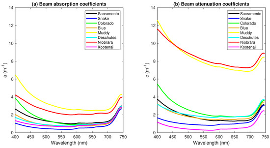 Inherent optical properties of the water column measured on the Kootenai River along with similar data from seven other rivers throughout the western USA for comparison. (a) beam absorption coefficients ; (b) beam attenuation coefficients .