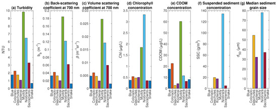 where is the solar zenith angle in water. Attenuation of light within the water column is the combined result of both absorption and scattering processes, with the latter represented by another IOP, the beam scattering coefficient , such that . Lacking measurements of across the spectrum (the EcoTriplet only recorded at 700 nm), we assumed that for all wavelengths, which allowed us to use our measurements of in place of in the numerator of Equation (2). This approach was conservative because in reality the back-scattering coefficient is a small fraction of the total scattering coefficient , especially in absorption-dominated, clear water with small concentrations of suspended sediment [38]. Moreover, using in Equation (2) would lead to an overestimate of and thus an underestimate of .