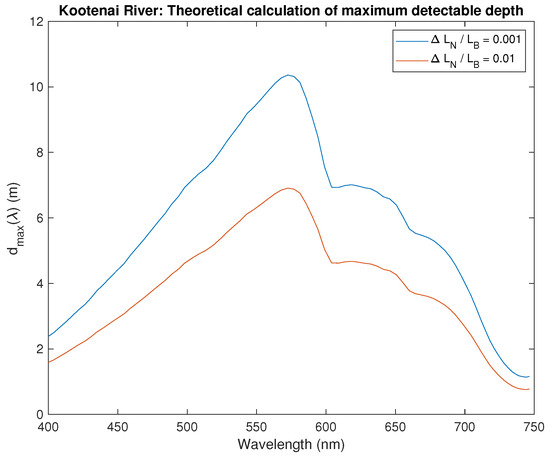 To assess whether this empirical, image-based estimate of the maximum depth the CASI sensor could detect on the Kootenai River was realistic, we made independent, theoretical calculations of based on field measurements of water column optical properties. More specifically, we used observed values of (Figure 3b) in place of in Equation (2) to approximate the diffuse attenuation coefficient . We then assumed values of 0.01 and 0.001 to calculate following Philpot [21] (Equation (1)). As described above, this approach was conservative and might have lead to larger values of and thus overestimates of the strength of attenuation by the water column, which would in turn reduce the calculated . With this caveat in mind, the results of this analysis are summarized in Figure 6 and substantiate the 9.5 m estimate of inferred directly from the CASI image via OPTID. The greatest calculated value of occurred at a green wavelength of 573 nm and was 10.4 m for the more sensitive detector with and 6.9 m for an instrument with a lower radiometric resolution and . The denominator band identified as optimal for the OPTID depth cutoff corresponding to the inferred was slightly longer, 587 nm. At this wavelength, the calculated values were only marginally less, 9.6 m and 6.4 m for the high- and relatively low-sensitivity detectors, respectively. Although characterizing a sensor’s noise characteristics is difficult in a complex fluvial environment [22], these theoretical values of are comparable to that estimated via OPTID, lending some additional credibility to the image-based approach proposed by Legleiter et al. [24] and built upon herein.