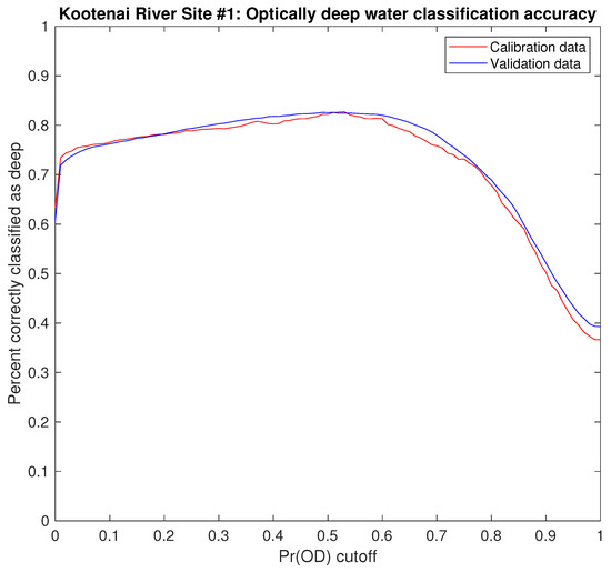 The output of the logistic regression model, however, was not a strict, binary assignment of a pixel to the shallow or deep class but rather a probability of observing optically deep water at that location. To use this information to define voids in spectrally based bathymetric coverage, the user must specify a cutoff probability for allocating pixels to the deep water class. To quantify the performance of our logistic regression modeling approach and assess the sensitivity of a hard, or crisp—as opposed to soft, or fuzzy (e.g., [53])—classification to the probability cutoff, we calculated the percentage of pixels correctly classified as optically deep for a range of probability cutoffs. This analysis was repeated for both the calibration data used to fit the logistic regression model and the much larger validation subset of the MBES survey data; results are summarized in Figure 9. For this site along the Kootenai River, the true proportion of measured depths greater than the inferred was 0.61, implying that if all pixels were assigned to the deep class, even if they had calculated values of 0, classification accuracy would be 61%; this scenario is represented by the y-intercept in Figure 9. Locations with such low probabilities of optically deep water were, by definition, highly unlikely to actually have , so classification accuracy abruptly rose to 72% even if the cutoff was only 0.01. Accuracy increased steadily with probability cutoff and reached a maximum of 83% when for both the calibration and validation subsets of the MBES survey data. The two lines in Figure 9 were very similar to one another, with the logistic regression model actually yielding slightly greater accuracies for the validation data withheld from model-fitting than for the calibration data used to parameterize Equation (9). This result implies that the logistic regression model was robust and applicable to observations other than those used to fit the model. Accuracy remained steady as the cutoff increased up to about 0.6, but then declined for greater values.