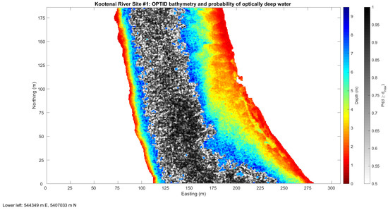 This probabilistic approach lends itself to a hybrid representation of river bathymetry like that shown in Figure 10, a map produced from the CASI image subset for Site #1 along the Kootenai River. For those pixels with , implying a reasonable degree of confidence that given the X value at that location, depth estimates were derived based on the OBRA output corresponding to the inferred via OPTID. Conversely, rather than make a spurious depth estimate where the water was likely to be optically deep, with , the map was instead populated with values that allowed us to visualize the likelihood that the true depth exceeds the inferred . Moreover, given a probability cutoff, such as the threshold we advocated based on Figure 9, a raster mask representing optically deep portions of the channel could be produced from a map of values like that shown in Figure 8b. This mask could be generalized and edited as needed and/or converted to a vector polygon that identifies voids in spectrally based bathymetric coverage, which comprised 46% of the channel at this site. This type of information could help to direct more efficient, targeted field-based sampling campaigns specifically designed to fill in gaps in depth maps produced via remote sensing. This hybrid approach thus took advantage of spectrally based techniques where they could provide reliable depth estimates but also acknowledged their limitations by highlighting deeper areas where supplemental field measurements would be required to obtain a complete representation of channel form.