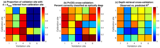 Inter-site cross-validation of spectrally based bathymetric mapping by applying results from a calibration site (matrix rows) to a distinct validation site (matrix columns). (a) Proportion of the validation site data deeper than the inferred via OPTID at the calibration site; (b) percent of the validation site correctly classified as optically deep when applying the Pr(OD) relation from the calibration site; (c) observed versus predicted for depth estimates at the validation site based on the OBRA relation established at the calibration site.