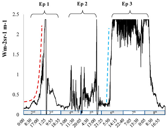 Spinning Enhanced Visible and InfraRed Imager (SEVIRI) Mid-Infrared (MIR) radiance acquired during the 2–8 December 2015 Mt. Etna eruption. Three different eruptive episodes occurred: lava fountaining (Ep 1), ash emission (Ep 2), and lava flow (Ep 3). Different episodes clearly show different trends that can be recognized a posteriori. However, differences are detectable even at the early stages of the eruption. An exponential trend and a sub-vertical trend seem to best fit the initial radiance increment for Ep1 (red dashed line) and Ep3 (blue dashed line) respectively.