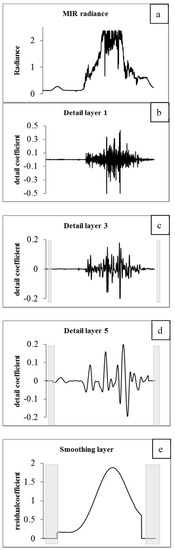 An example of multiscale decomposition with the à trous discrete wavelet transform algorithm. Seven detail layers have been generated with dyadic scaling sequence (only three are shown for clarity, Plates 2b, 2c, and 2d). Detail layers are generated for a growing scaling sequence of powers of two. The layers are generated for scales of 1, 2, 4, 8, … samples. For example, the fourth layer contains structures with characteristic scales between five and eight samples. Wavelet decomposition results in a border distortion which increases with the power of two at each decomposition scale (indicated in figures with grey areas). The original SEVIRI MIR radiance time-series is shown in Plate 2a. Detail layers at increasing characteristic scales contain larger signal structures. At the end of the sequence is the residual layer (Plate 2e), which contains all of the remaining unresolved structures.