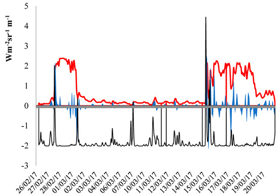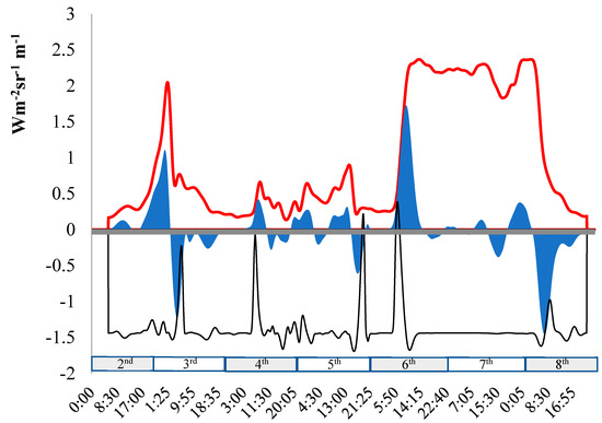 The sensitivities of the results were tested against different trends. Figure 4 shows the kurtosis (black line) and gradient (blue filled curve) values derived from smoothing layer (red line) at every SEVIRI acquisition (every 5 min) during the 2–8 December 2015 Etna eruption.