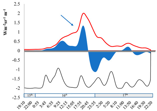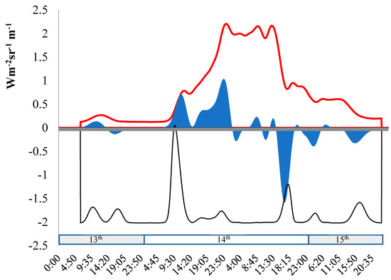 Plate 2a of Figure 2 shows a time-series of MIR radiance obtained for a short lava fountain event occurred at Mt. Etna from 13 to 15 December 2013. The detail layers and the residual layer from wavelet transform are shown in Plates 2b–e. Both detail and residual layers have potentials to be used for the assessment of eruptive phenomena. High-frequency changes occur at the earliest decomposition steps. Therefore, detail coefficients of the first scale layer are ideal to trigger the initial phase of the eruption (Plate 2b). One property of the wavelet transform is to have a sampling step proportional to the scale [28]. This implies that significant structures (e.g., local maxima) in lower-detailed scale layers match structures in higher-detailed scale layers (Plates 2b, c, d). This property allows “following” the eruptive signal in subsequent transformations where the higher frequency content of the signal is progressively eliminated.