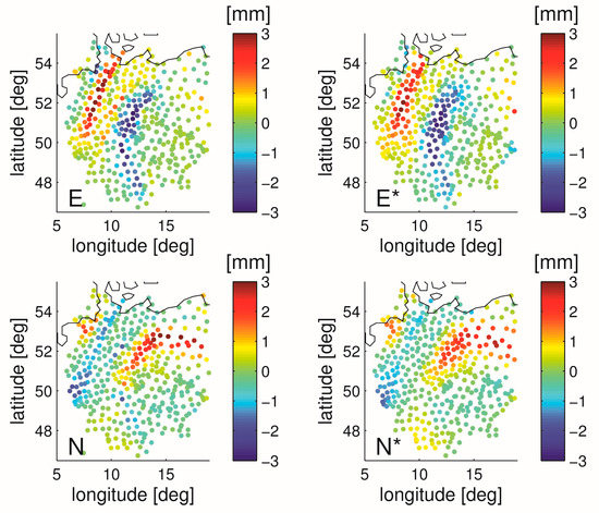 Here λ and ϕ denote the station longitude and latitude, R denotes Earth’s radius, and the factor C is related to the scale height of the wet refractivity gradient. Hence, if we know the wet gradient at the station then we know approximately the horizontal ZWD gradient at that station and vice versa [36]. In order to demonstrate this, we chose a station and selected neighboring stations within a radius of 1°. We collected the ZWDs from these stations, assumed that the ZWD can be expanded in a Taylor-series and obtained by a least square fit the horizontal ZWD gradient at the chosen station. This horizontal ZWD gradient at the station was roughly proportional to the wet gradient at the station. We repeated this procedure for each station in the benchmark data set. For some stations the complex terrain may play a role, however, so we left this investigation for future research. We chose an epoch where strong tropospheric gradients were present (31 May 2013, 18 UTC). We experimented with the factor C and found that an appropriate choice was 4 km. We utilized NWM data (similar results are obtained if we utilize GNSS data). The left panels of Figure 2 show the wet east and north-gradient component and the right panels of Figure 2 show the approximation for the wet east and north-gradient component. The gradient components do not match perfectly but the validity of the approximation is obvious. To some extent the differences between the left and right panel are due to the fact that C is chosen to be 4 km for any location. Nevertheless, it is clear that we have a tool with which we can at least approximately convert tropospheric gradients to horizontal ZWD gradients.