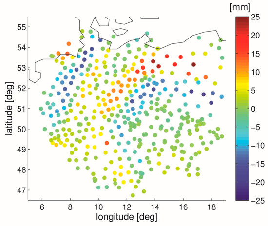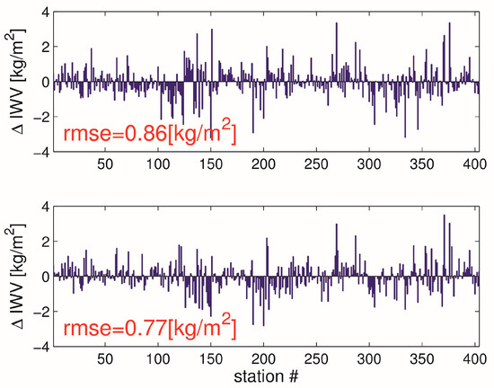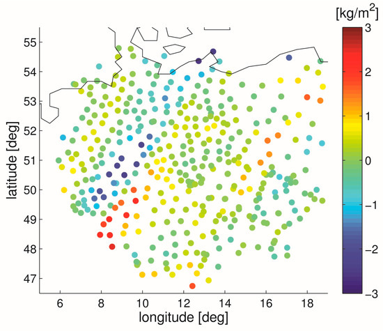 The inclusion of the tropospheric gradients in the interpolation only makes a difference during severe weather. The tropospheric gradients are smaller during calm weather which is somewhat true for most of the days. As a result, the average impact is naturally small. It is thus recommended to take a closer look on specific epochs. As another case study we choose 10 May 2013, 6 UTC, the epoch used for illustration in the introduction (refer to Figure 1). However, instead of the interpolated ZWD we look at the interpolated IWV. The scatter plot in Figure 9 shows the station specific IWV differences between the interpolation strategies on 10 May 2013 at 6 UTC. The tropospheric gradients shown in Figure 1 explain why IWV differences are larger in some areas than in other areas. In south-west Germany, IWV differences reach up to 3 kg/m2. In Figure 10 the upper (lower) panel shows the IWV error of the first (second) interpolation strategy. On average (mean over all stations) the Root Mean Square Error (RMSE) is reduced by about 10% when tropospheric gradients are taken into account.
