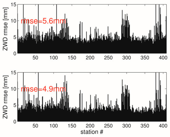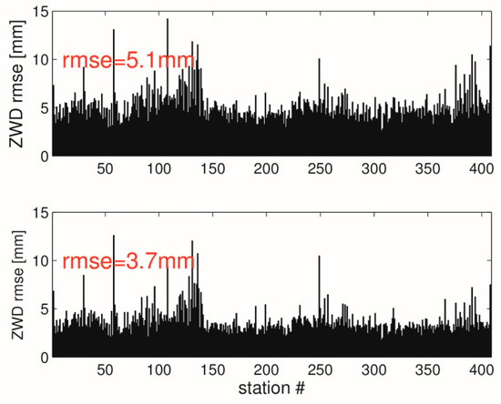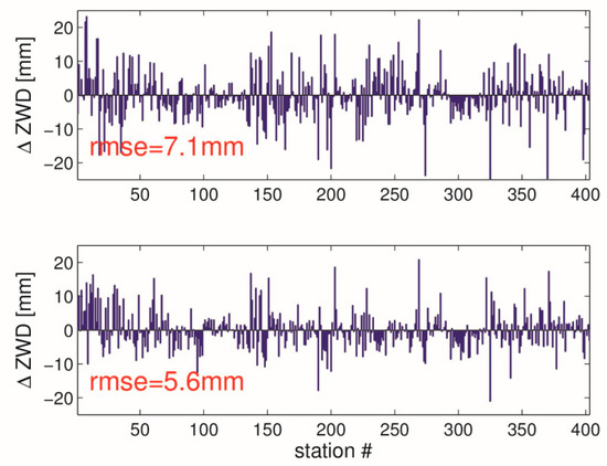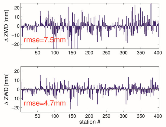 GNSS data are used instead of NWM data. The upper panel shows the ZWD interpolation error when only ZWDs are used. The lower panel shows the ZWD interpolation error when both ZWDs and tropospheric gradients are used. The red numbers provide the RMSE (average over all stations). Results are valid on 31 May 2013, 18 UTC.