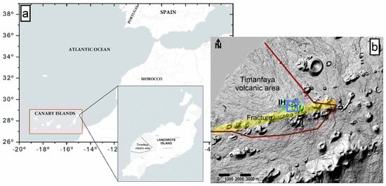 (a) location map of Lanzarote Island in the Canary archipelago (Spain); (b) shaded relief of the volcanic area of Timanfaya on Lanzarote Island, showing the National Park boundary (red line) and the eruptive fissure (thick yellow line) of the 1730–1736 volcanic eruption. The blue rectangle marks the area of thermal anomalies located at Islote de Hilario (IH).
