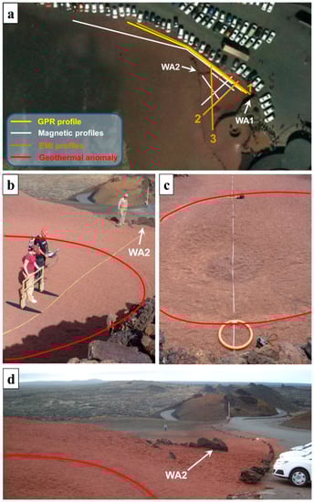 (a) location of the different surveys performed at the Islote de Hilario area (GPR, EMI and magnetic survey) and the geothermal anomaly; (b) GPR survey data acquisition. One of the man-made walls (WA1) can be seen at the beginning of the profile; (c) EMI survey data acquisition. The coils are placed on the boundaries of the circular geothermal anomaly area (red line); and (d) a person carrying the proton magnetometer during the magnetic survey data acquisition. A second man-made wall (WA2) can be seen at the middle of the profile.