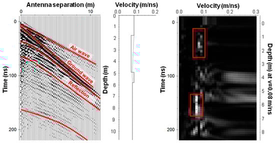 The reflection profiles recorded during the two different field campaigns were identically filtered using the processing sequence described in Table 1 with the ReflexW software (version 8.5.7, Sandmeier geophysical research, Karlsruhe, Germany) [17]. The velocity of propagation obtained from the CMP (using the algorithm semblance analysis [18]) was used for topographic correction as well as to convert the time window of the radargrams into depth values (Figure 4).