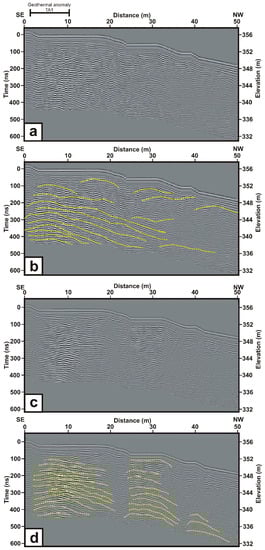 GPR data for the profile across the geothermal anomaly area: (a) observed radargram (May 2012); (b) interpreted radargram (May 2012); (c) observed radargram (April 2015); (d) interpreted radargram (April 2015).