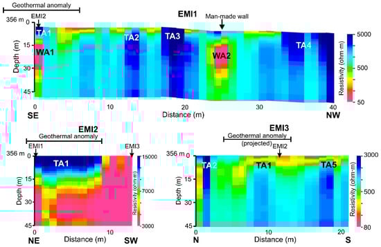 The EMI3 profile (Figure 5, lower right panel) runs tangentially to the geothermal anomaly area. For reference, the location of the nearby geothermal anomaly zone has been projected. Low to medium resistivity values dominate most of the shallower parts of the profile (up to ~5–7 m depth); however, for profiles EMI1 and EMI2, high-resistive areas are imaged at greater depths extending downwards to ~45 m depth. The first area is located 1–2 m from the beginning of the profile and corresponds to TA2 in the EMI1 profile; the second area at 8–10 m is immediately beneath the projection of the centre of the geothermal anomaly (TA1 in the EMI1 and EMI2 profiles). The third area (TA5) is located at 17–19 m. Considering the previous profiles, the high-resistive areas correspond to the location of hot gases emanating from the faults buried by pyroclastic deposits, which would also extend laterally close to the surface.