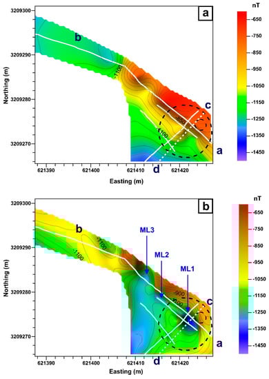 Based on this hypothesis, we performed a 2.75D forward modelling (Figure 7) with Geosoft GM-SYS software (version 8.1, Geosoft Inc., Toronto, Canada) along the two orthogonal profiles shown in Figure 6: profile ab, which coincides with both the GPR and EMI1 profiles; and profile cd, which runs parallel to the electromagnetic profile EMI2 (see location in Figure 2a). Profile cd was selected for modelling considering that it cuts the “magnetic low 1” symmetrically. Both profile data (ab and cd) were obtained by “slicing” the reduced-to-the-pole magnetic grid (Figure 6b).