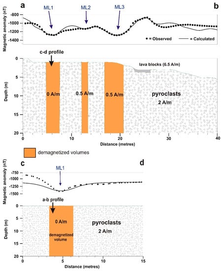 Forward magnetic models along the ab and cd profiles shown in Figure 6; the intersection between both profiles is marked in each of them. Magnetic lows were modelled by means of totally/partially demagnetized vertical bodies as a consequence of high temperatures in the subsoil. The quantities expressed in A/m represent the induced magnetization of each body. The sizes of the demagnetized bodies in the direction perpendicular to the profile are: in profile ab, left body (0.5 m to the North, 2.5 m to the South), middle body (0.5 m to the North, 5 m to the South) and right body (5 m to the North, 5 m to the South); in profile cd (1 m to the East, 2 m to the West).