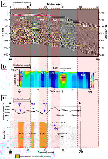The EMI1 profile (Figure 5, top panel) shows four high resistivity areas at the surface, which are located at the beginning of the profile (0 to 3 m, TA1), at the middle part (11 to 15 m, TA2, and 17 to 22 m, TA3) and at the end (30 to 40 m, TA4). These high resistivity anomaly zones continue vertically at a depth of, at least, 40 m. The first high-resistive zone (TA1) is located at a well-known circular geothermal anomaly area, whereas the last zone (TA4) is located close to some old monitoring wells used to measure ground temperature, reporting temperature values as high as 388 °C at 7.5 m depth [10]. Considering this, the intermediate high-resistive areas must also be related to geothermal anomalies (TA2 and TA3). Thus, the four high-resistive anomaly areas are associated with high ground temperature zones at the surface that extend vertically downwards through the pyroclastic deposits. The lowest resistivity anomaly values (WA1 and WA2 in Figure 5), placed at both the beginning of the profile and at 28–30 m, are located ~15 m below the surface, but they do not continue at depth. These low-resistive anomaly values agree with the location of man-made walls (Figure 2b,d) built using local basaltic lava rocks as bricks. Considering all this, we suggest that the occurrence of fractures in the underlying volcanic rocks act as conduits for the emission of gases at high temperature, and the surface geothermal anomaly areas are located immediately above these fractures. The high temperature values would modify the electromagnetic properties of the pyroclastic rocks, resulting in an increase in their resistivity values. The significance of the localized low resistivity zones WA1 and WA2 is that they are impacted by the effect the man-made walls have on the coils when they are very close to the walls; therefore, in this case, they can be considered an artefact of anthropogenic origin. Moreover, the intermediate resistivity values located at the surface between TA1-TA2 and TA3-TA4 represent pyroclastic deposits with a ground temperature that is lower than the geothermal anomaly areas.