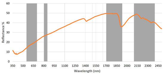 Spectral signature of a sandy loam soil with 5.43% organic carbon (OC) based on data from [28] and important wavelengths highlighted with grey color for soil OC (SOC) estimation according to bibliographic review.