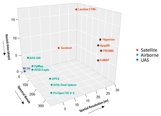 RS from diverse sources provide unprecedented data streams for the retrieval and hence monitoring of SOC across the VNIR–SWIR spectral range. In the context of imaging spectroscopy, the different sensor types can generally be mounted on either airborne [40] or spaceborne platforms. Concurrently, Unmanned Aerial Systems, (UASs) are rapidly maturing and becoming available to carry out the next generation of hand-sized hyperspectral imagers [41].