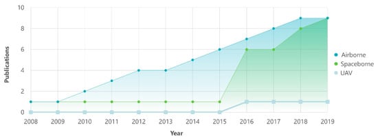 RS techniques vary depending on their spatial, spectral, temporal and radiometric resolution and the platforms that are mounted on as illustrated in Figure 2. Selecting the proper technique depends on the field of application, the measured property and the expected accuracy. These technologies have shown their great use for monitoring environmental parameters towards management of natural resources and their rapidly increasing use is due to the significant advancements in terms of sensors specifications. Sensors mounted on satellite platforms have improved from panchromatic to multispectral and the forthcoming hyperspectral, such as EnMAP, HyspIRI, and PRISMA. Hence the availability of these sophisticated hyperspectral sensors, could expedite RS applications in the field of agriculture, while contribute to an advancement of operational applications for environmental purposes. Subsequently, they could provide valuable information on soils’ condition and SOC estimation either directly or by providing auxiliary data. Consequently, they could supply the necessary data for accurate and up-to-date soil maps to meet the current and future needs for soil monitoring. Figure 3 shows the trend of scientific publication across the various RS techniques.