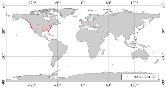 The outcomes of the second part of the analysis allowed the assessment of the most appropriate aggregation intervals usable to provide information regarding the rainfall amount and to evaluate the presence of places potentially affected by hydrometeorological disasters. The IMERG half-hourly early and late products were compared with the rain gauge measurements in order to evaluate their relative accuracy. The present study covered different climatic zones with the aim to carry out a valid analysis on a global scale. Fifty different locations were analyzed (Figure 1). The location choice was the result of a preliminary analysis aimed at identifying institutions [23,24] that collect and publish free rain gauge data with a good temporal resolution. In order to investigate the accuracy even at the sub-daily scale, the rain gauge measurements with a temporal resolution of at least one hour were chosen.