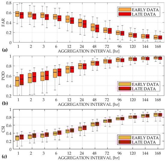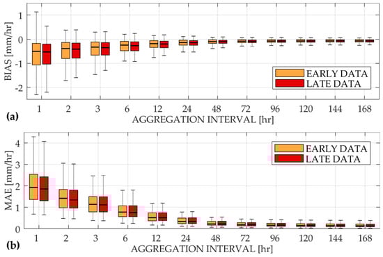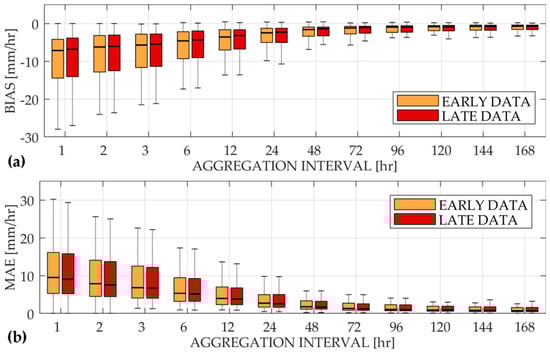 The bias and mean absolute error were calculated for every aggregation interval previously mentioned. The results are reported in Figure 2, taking advantages of the peculiarity of a boxplot. In these figures, the first quantile, the median value of the distribution and the third quantile are identifiable. The mean values are instead summarized in Table 2. On the whole, a negative value of the bias emerged from the analysis. As a general rule, therefore, the satellite-derived data tend to underestimate rainfall with respect to the rain gauge. Several studies [15,16,17,18,19] reported in Section 1 agreed with this statement. A good accuracy for a near real-time application was obtained with aggregation intervals greater or equal to 12 h. For longer aggregation intervals, the bias tends to have a null value, allowing more accurate information. The early and late data performed similarly.