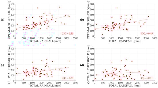 Figure A3, Figure A4, Figure A5 and Figure A6 show the relationship between the optimal thresholds and the total rainfall for a set of different aggregation interval (12, 48, 72 and 96 h) using a missed alarm cost equal to 5 and a false alarm cost equal to 1. The results related to a 24-h aggregation interval were instead discussed in detail in Section 3.3.